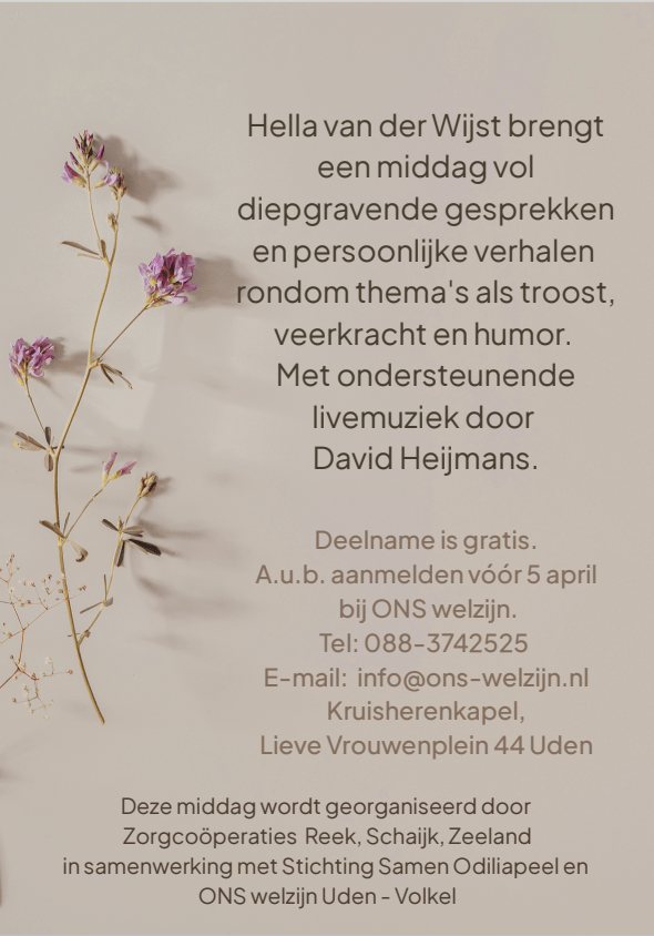 Bent u een luisterend oor voor anderen ?Bij de UP!-groepsgesprekken praten ouderen over thema’s die hen bezighouden: afscheid, familie, het ouderlijk huis en meer…Binnenkort start Zorgcoöperatie Reek met deze bijzondere gesprekken, en wij zoeken enthousiaste gesprekbegeleiders om deze bijeenkomst Lees meer