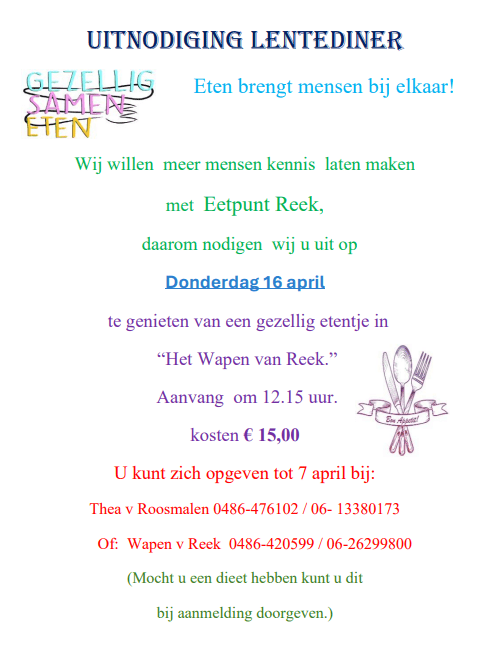 Elke laatste zondag van de maand kom op de “zondagse” soep! (kleine lunch) in de Babbelaer.Van 11:00 tot 13:30 uur zien wij u graag verschijnen voor een gezellig praatje, kopje koffie/thee en een lekkere soep (kleine lunch).Meld u Lees meer