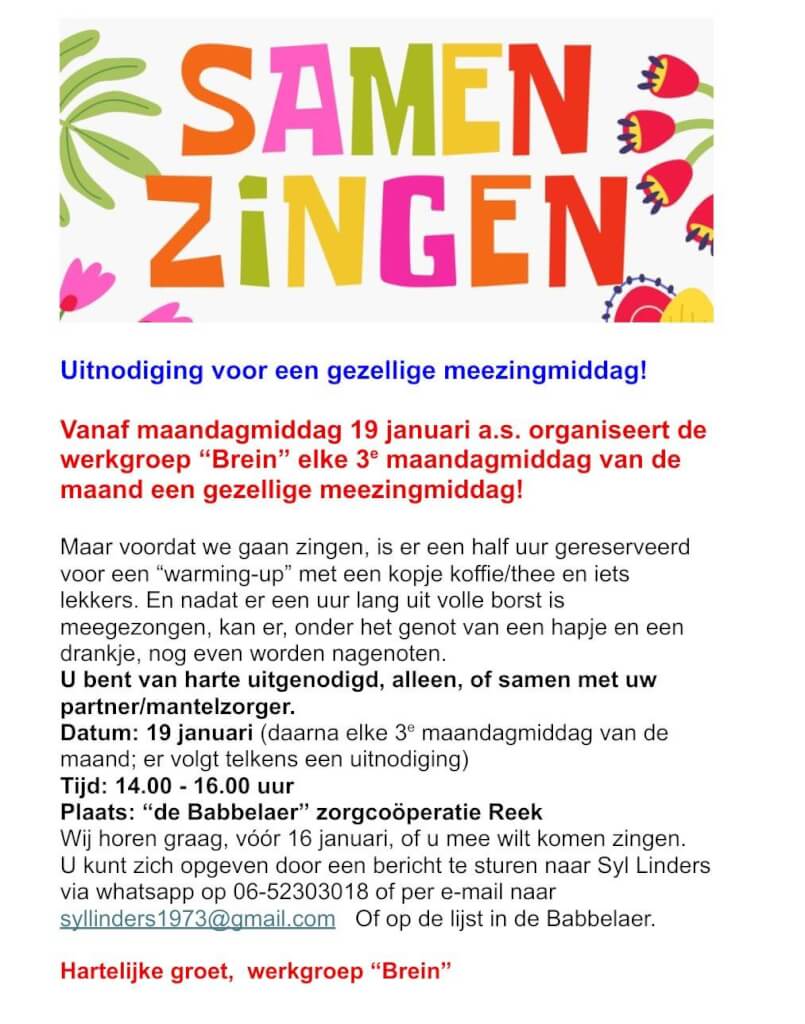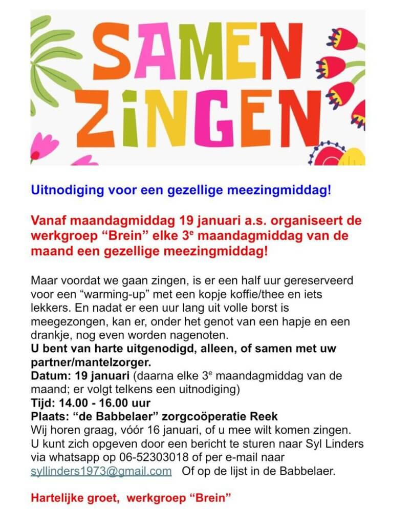 Gelieve aan te melden voor 10 januari bij Gertie Theunissen. tel: 06-11038370 gertie.theunissen@zorgcooperatie-reek.nl