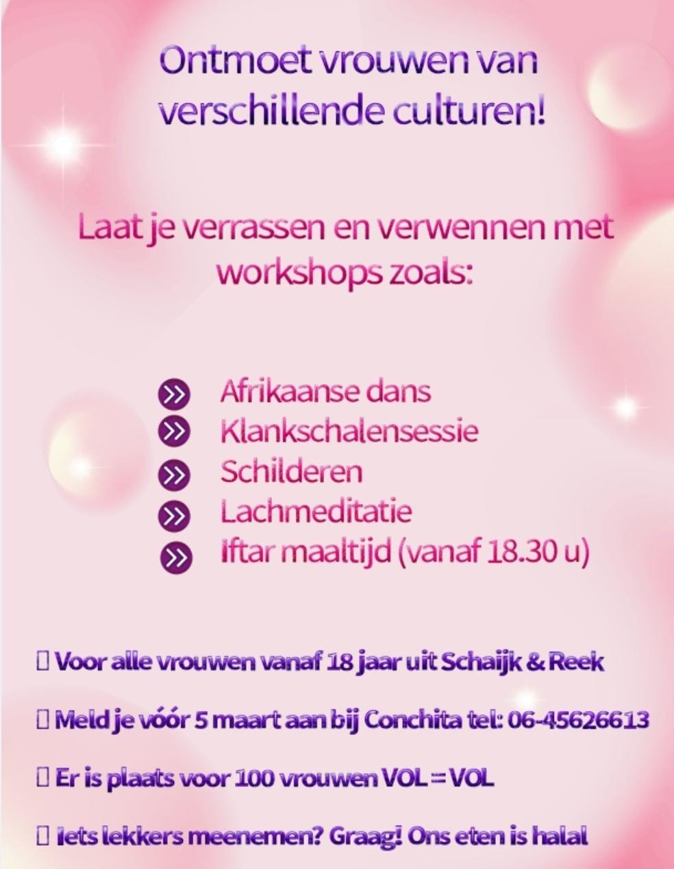 GRATIS WORKSHOPS INTERNATIONALE VROUWENDAG REEK & SCHAIJK Op zondag 8 maart vieren we Internationale Vrouwendag speciaal voor alle vrouwen uit Reek en Schaijk! We organiseren deze dag samen met Zorgcoöperatie Reek en Schaijk. Een dag om elkaar te ontmoeten, te verbinden en samen plezier te maken.