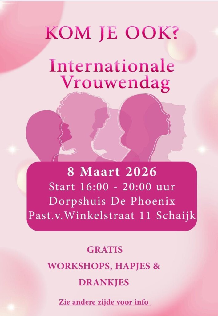 Zondag 8 maart, van 16.00 tot 20.00 uur in het Dorpshuis de Phoenix in Schaijk. De dag is speciaal voor alle vrouwen vanaf 18 jaar uit Reek en Schaijk. Deelname is gratis, maar meld je wel even aan via Whatsapp, 06-45626613. Er is plek voor 100 vrouwen.