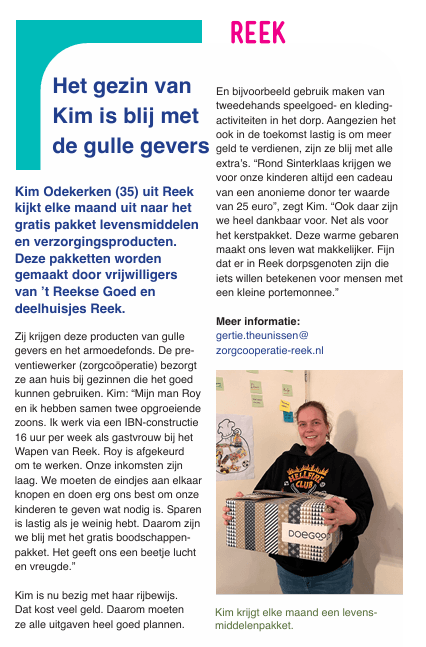 Kim ontvangt elke maand een gratis pakket met levensmiddelen en verzorgingsproducten. Deze pakketten worden gemaakt door vrijwilligers van ’t Reekse Goed en deelhuisjes Reek. Zij krijgen deze producten van gulle gevers en het armoedefonds.