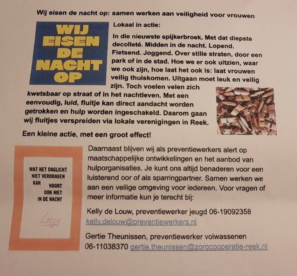 Inmiddels hebben verschillende (jonge) vrouwen van lokale verenigingen uit Reek een fluitje ontvangen namens preventiewerkers Reek.