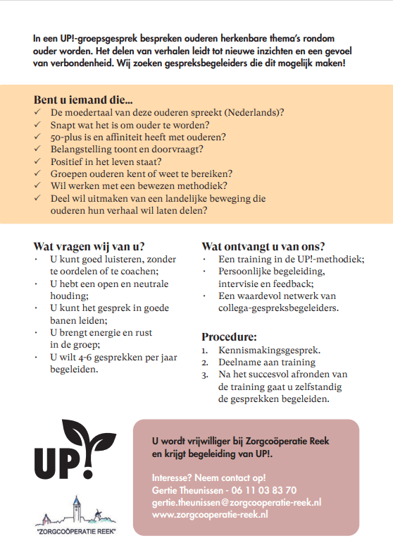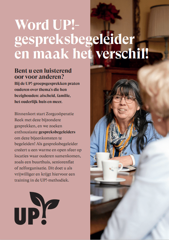 Bent u een luisterend oor voor anderen ?Bij de UP!-groepsgesprekken praten ouderen over thema’s die hen bezighouden: afscheid, familie, het ouderlijk huis en meer…Binnenkort start Zorgcoöperatie Reek met deze bijzondere gesprekken, en wij zoeken enthousiaste gesprekbegeleiders om deze bijeenkomst te begeleiden !